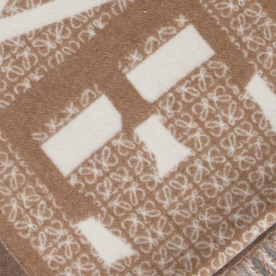 Loewe Beige Wool Love Jacquard Scarf. Made from a wool and cashmere blend. White and cream letter logo on the front, contrasting white anagram pattern throughout, tassel detail. White background.