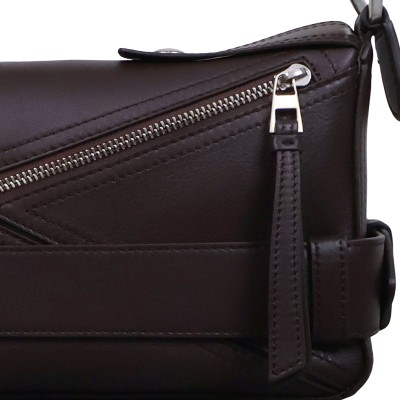 The Puzzle is defined by its distinctive geometric lines and its cuboid shape. This small version is crafted in shiny calfskin with biker-inspired details.