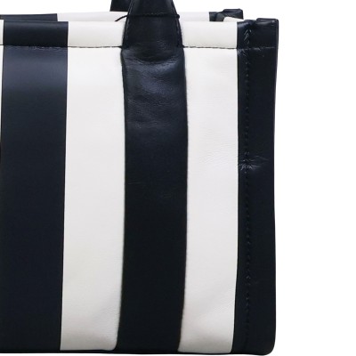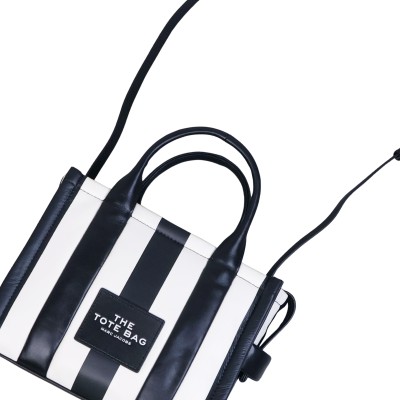 This version of our small tote bag is refreshed in the season’s monochrome stripes inspired by designs from the Spring/Summer 2013 runway. Inside, it includes one interior slip pocket and one card slot. Carry it by the top handles or wear it as a crossbody bag with the removable, adjustable leather strap. Explore all the different tote bag sizes in our size guide.
